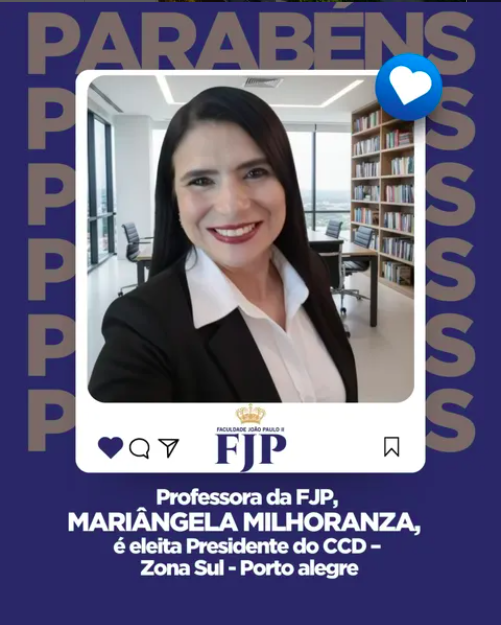 É com imensa alegria que compartilhamos a eleição da Professora da Faculdade João Paulo II, Mariângela Milhoranza, como Presidente do CCD – Zona Sul. 🌎📚