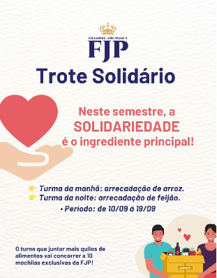O semestre começou e é hora de unir forças pelo bem! 💙 No Trote Solidário da FJP, cada turno tem uma missão especial: